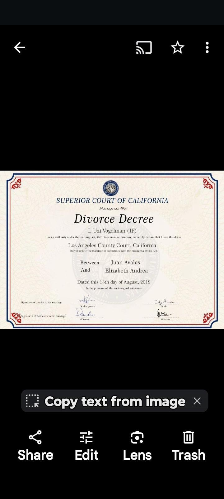 I have been chatting with Julian juan Avalos, and i asked for proof that he was Divorced and he send me this