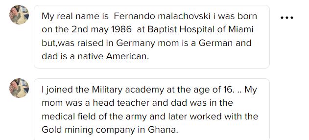 I confronted him about him being an Internet scammer and of course he denied the whole thing ? This man it me up on TicTok then asked me to talked to him on hangouts he said his name was Bradley Malachovskl he talked to me for a couple of days he said that he was in the US Army in Turkey I think can’t remember…….He called me on the hangout app…..He sounded just like an African and I called him out on it of course he denied he was African ??ummm yea ok….He also asked me to email his Commander… Read more »