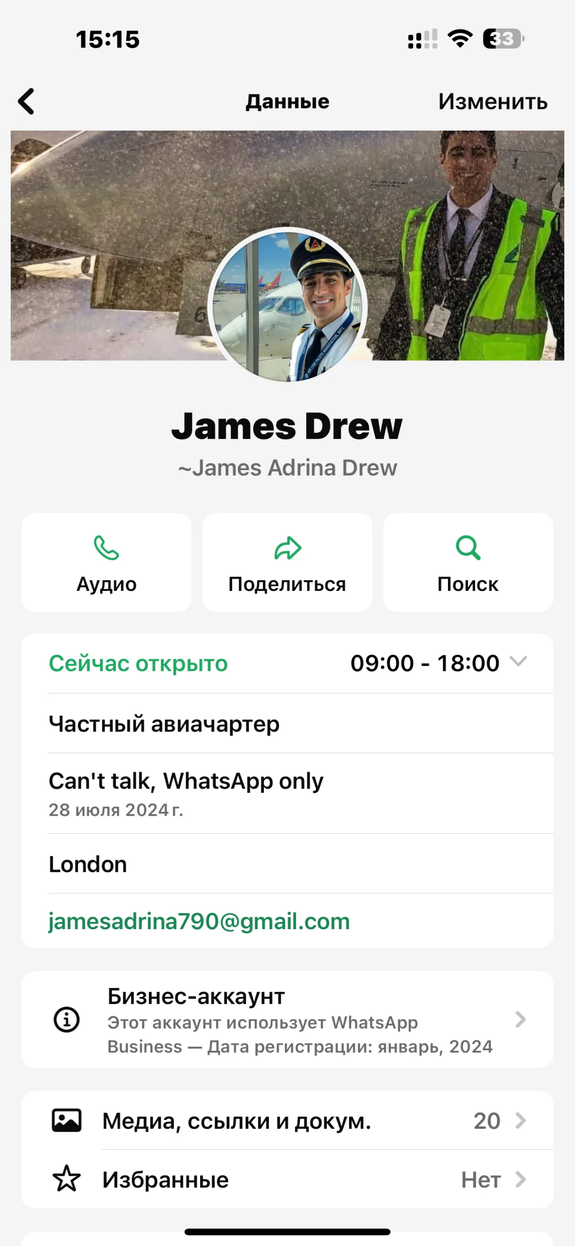 Здравствуйте, дорогие. Этот человек познакомился со мной в инстаграм. Пилот, капитан дальнего полета 😅 Попросил практически сразу перейти в what’s app. Общение было супер романтичным, присылал видео, милейший парень, красиво пишет, собачка имеется, вскользь рассказал что потерял жену во время родов, я не особо расспрашивала, просто не знала до чего дойдёт это общение. Общались только по-английски.